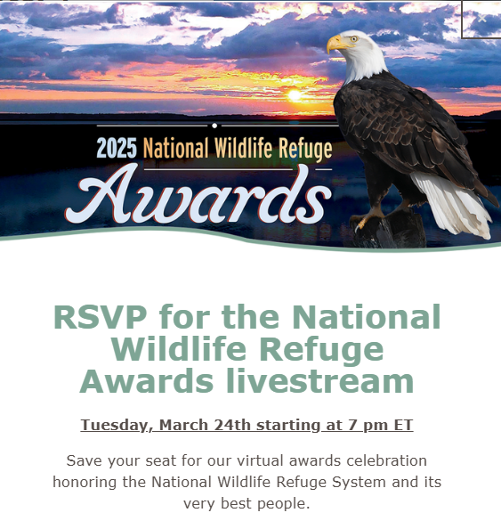 The 2025 National Wildlife Refuge Awards virtual celebration is on Tuesday, March 24th! We can’t wait to celebrate with you!